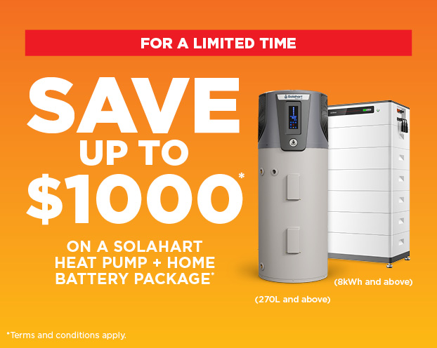 *$1,000 point of sale discount applies to the purchase of a package deal that includes an eligible Solahart Heat Pump (270L litres and above) together with a Home Battery (8kWh and above) in one transaction. Offer available from 10/03/2026 until 30/04/2026. Excludes commercial installations and Tesla Batteries. Not available in conjunction with any other offer.
